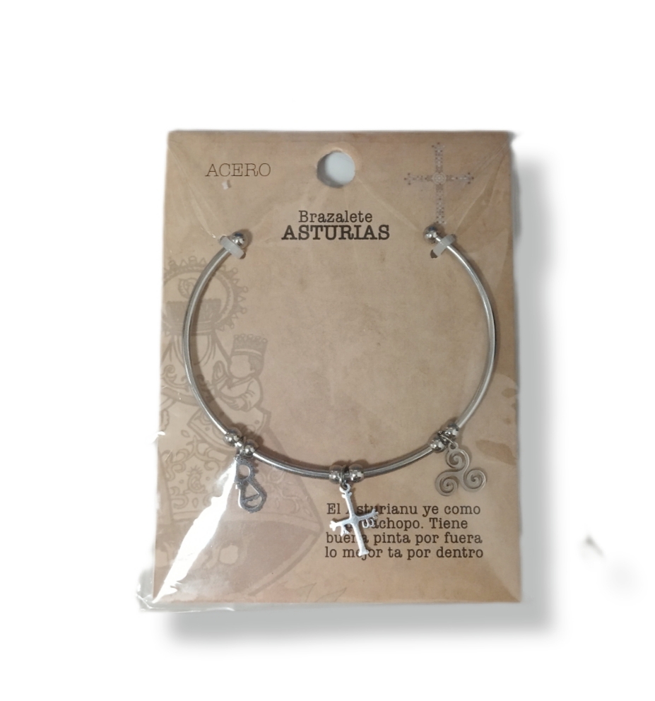 Precioso brazalete de acero con 3 pequeños colgantes: la Santina, la Cruz de la Victoria y un Triquel.